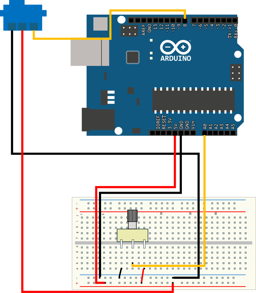 プログラムは前記事のものを改造しました。サーボーは8番に接続してロータリーポテンショメータはアナログピンのA0に接続しています。mapはロータリーポテンショメータの数値(0-1023)を角度(0-180°)に変換しています。