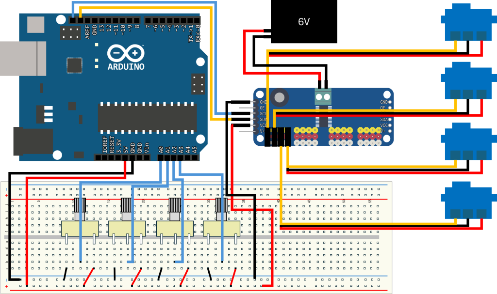 接続はこんな感じです。ブレッドボード上で接続しています。サーボ用電源で単三乾電池を4つ使っています。Arduinoから5V流しているはポテンショメータとpca9685ボードの電源です。