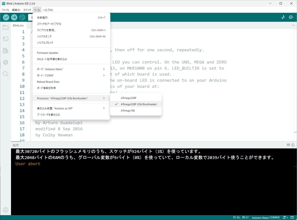 Amazonのコメントで親切な方のブートローダーを「Atmega328p(Old Bootloader)」に切り替えないとダメという書き込みを発見。